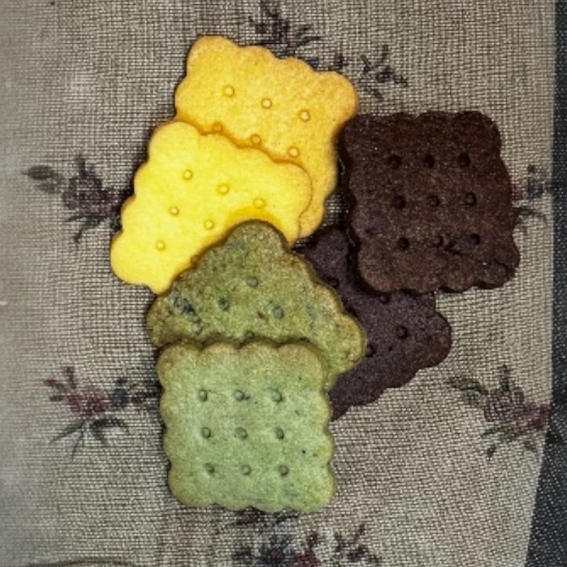 Frolle pistacchio: uova, farina 00, burro, zucchero, sale, farina di pistacchi
