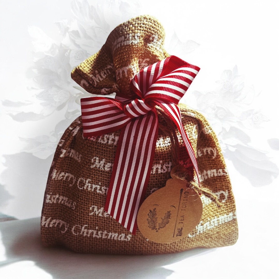 la confezione è in un sacchetto di iuta con stampa ‘Merry Chrsitmas’ e contiene: